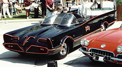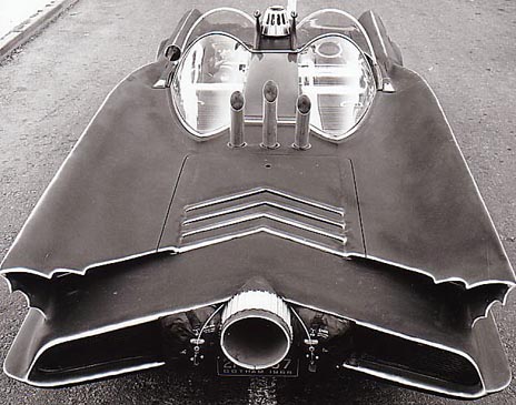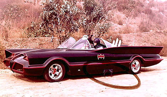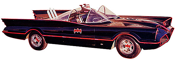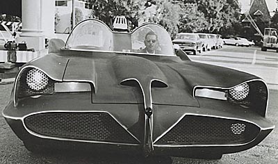 ![]() I augusti 1965 blev George Barris kontaktad av 20th Century Fox att bygga en bil för The Batman TV-show. 1 september skrevs kontraktet att bygga bilen och Barris kontaktade sin vän Dean Jeffries (Monkee Mobilens skapare) och Jeffries ritade ner en bil med vingar och en front som skulle påmina om en hungrig fladdermus och utgick ifrån en 1959 års Cadillac. ABC hade bråttom och Jeffries hade ingen möjlighet att få bilen klar på en månad som ABC ville så han bollade över det till George igen och George antog utmanning om han fick utgå från Jeffries ritningar men nu var det bara 3 veckor kvar tills bilen skulle vara klar. George Barris tog en fika på bakgården och fick syn på Futuran som stod parkerad där och nu var det klart den hade allt, fronten såg ju nästan ut som en fladdermus och vingarna fanns ju där, fram med Jeffries ritningar och bygget var igång grillen gjordes om för få den att likna en fladdermus med öppna mungipor, öronen fanns redan ju där och blinkersglassen fick bli fladdermusens ögon. Vingarna förlängdes till 86 tum (214,20cm) och fick taggade avslut som en fladdermuvinge och rundades av i framkant, för övrigt behölls det mesta av formgivningen på Futurans bakparti, ett jätteavgasrör och två! fallskärmar monterades. COOLT!!!