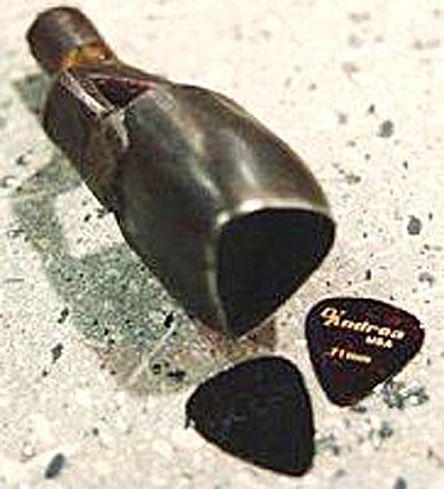 Plektrumet Plektrumet eller the Pick som jänkarna säger Inget man lägger något större märke till eller en seriös tanke om. En plastbit som faktiskt har en stor del av vad du har hört i dina dagar, en plastbit som faktiskt hör till plastens historia i vår värld. För en del som jag själv bryr jag mej inte så mycket, mer än tjockleken, men för en del så är man gift med sitt plektrum och det finns dom som hör och häpna har haft samma plektrum i åratal och är hur rädd som helst att förlora det för att det inte längre tillverkas. Eftersom jag jobbat i musikaffär hela mitt liv så hat jag sett många olika typer av plektrum Celluloid, plast, nylon hör väl till det vanligaste, mässing, stål, sten, ben och ebenholts är också vardagsmat idag, men första Musikaffären jag jobbade på Walles Musik där fanns det plektrum i sköldpaddsskall med konstiga former. Men det har funnits plektrum gjorda av fågelfjädrar som struts, örn och korp. Elfenben, cocosnötsskal och faktiskt var ost ett tidigt plektrum. Vad få vet är att hela ditt personliga sound sitter i plektrumet, hårdheten, materialet, hur du håller plektremet och ditt anslag är ditt sound. Joe Walsh (Eagles) sa i en intervju att han inte förstod sej på alla som undrar vad han har för förstärkare och effekter för att få sitt sound, ingen frågar mej vad jag använder för plektrum och det är ju där hela mitt grund sound sitter. Men hur började det? Ja man säger att pilbågen var världens första stränginstrument och följdaktig måste då det första plektrumet varit spetsen på pilen och det är ju fortfarande idag formen på ett plektrum. Lutan i början av tusentalet använde man ofta spetsen på en fågelfjäder för att den var elastisk man började förstå att det gick att nyansera sitt spel med ett elastiskt material. Det första instrumentet som bara spelades med plektrum var den Neapolitanska Mandolinen strutsfjäder var det vanligaste plektrumet och man fick ut ca 5 plektrum per fjäder så en Struts kunde ge plektrum för tio år framåt och ge mat till ca 40 personer. Nya material till plektrum började dyka upp på 1800 - talet, allt från torkad ost till bark från körsbärs träd till en dag då man i Spanien och Portugal kom på att använda sköldpaddskal för då kunde man göra ett tunt plektrum. Plektrumen var gjorda för hand av sköldpaddsskal som hettats upp och tillplattats, dessa plektrum gav en helt ny ton och var flexibla beroende på dess tjocklek. Sköldpaddsskal plektrumet fick namnet Tortsie Shell pick när dom första importerades från Spanien till USA i början på 1900 talet av en man som hette John Farris som byggde en 8 strängad mandolinbanjo och han tog även patent på sitt plektrum. Plektrumet hade fått sin form men utländska tullar på havssköldpaddor och få exportörer på skal gjorde plektrummen dyra att tillverka så man började leta nya material. Läder, oxhorn, elfenben och gutta percha, ett hårt gummi liknade material som utvanns från träd i Borneos djungler men man ville ha något som var flexibelt och snabbt utgick till utgångspunkten. Svaret på frågan fann man i en helt ny substans som var något helt nytt för vår värld att se. Miracle mannen John Wesley Hyatt gjorde en produkt som skulle produceras i massor av industrin, Celluloid den första kommersiella plasten. Hyatt höll på och experimenterade med kollodium (bomullskrut upplöst i nitro cellulosa) för att göra ett vattentätt bandage. Hyatt tillsatte Kamfer en olja som utvinns ur träd hettade upp det och plattade till det och Celluloiden var uppfunnen en produkt det skulle ta ca 30 år innan man förstod vad man kunde använda materialet till. Dom första mandolinplektrumen såg dagens ljus vid sekelskiftet och blev snabbt populärt eftersom det var lättare att spela ett vibrato med ett flexibelt plektrum än med dom tidigare varianterna och dessutom var dom avsevärt mycket billigare än Tortsie plektrumen, man fick ett dussin celluloid plektrum till priset av ett Tortsie vilket gjorde celluloiden till det material som skulle bli nummer ett för plektrum tillverkning. Tum och finger plektrum kom så tidigt som 1909 man var irriterad på att man tappade plektrumet hela tiden och för 5 strängs banjo var det uteslutet att använda ett flatpick, Problemet att inte tappa plektrumet hade man en mängd tidiga lösningar på bland annat borrade man hål i plektrumet och träde en tråd igenom som man skulle ha över tummen och pekfingret men det blev ingen större succé. Det tog ända fram till 20 talet innan plektrumet blev ett gitarrplektrum Gibson och Martin hade börjat att göra stålsträngade gitarrer och en gitarrist vid namn Nick Lucas var en av dom första som spelade in med plektrum ett helt nytt gitarrsound var funnet. Ungefär samtidigt hade en herre vid namn Luigi D'Andrea börjat tillverka plektrum och det var Luigi D'andrea som förärade Nick hans första plektrum. D'Andrea Luigi D'andrea startade sin plektrumtillverkning